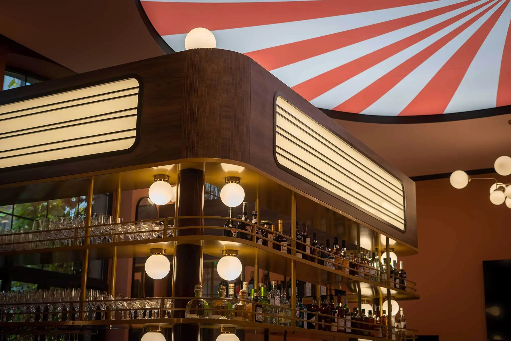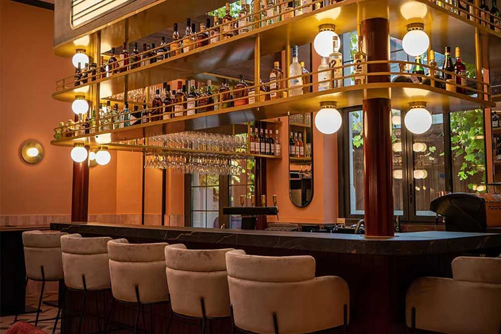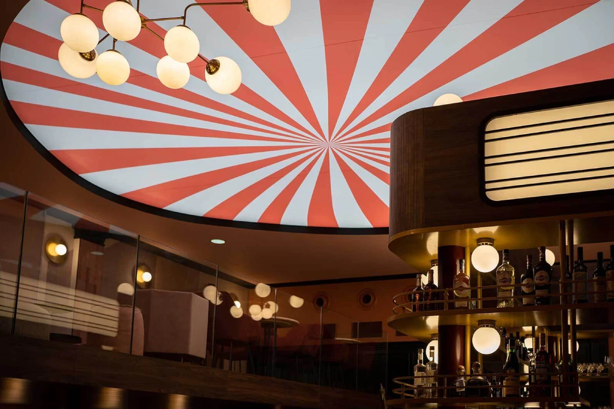 Ici, on troque les rideaux rouges pour un univers haut en couleur du patio intérieur à la mezzanine !